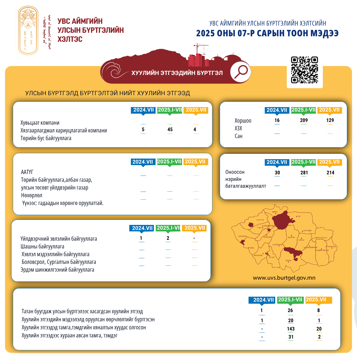 Увс аймгийн улсын бүртгэлийн 2025 оны 7-р сарын тоон мэдээ