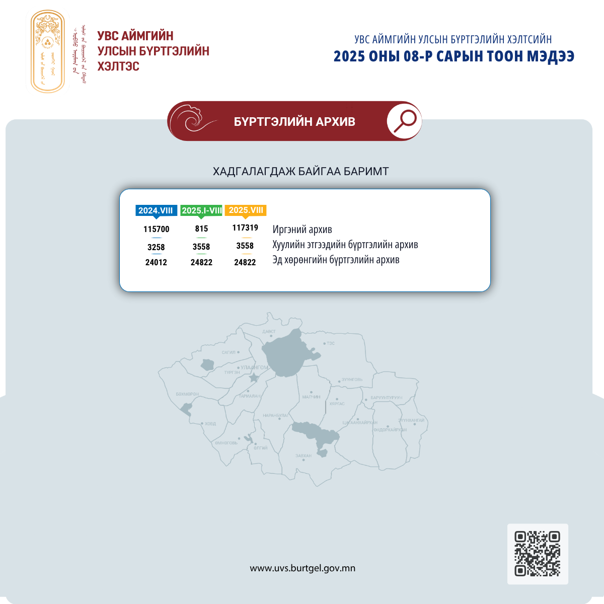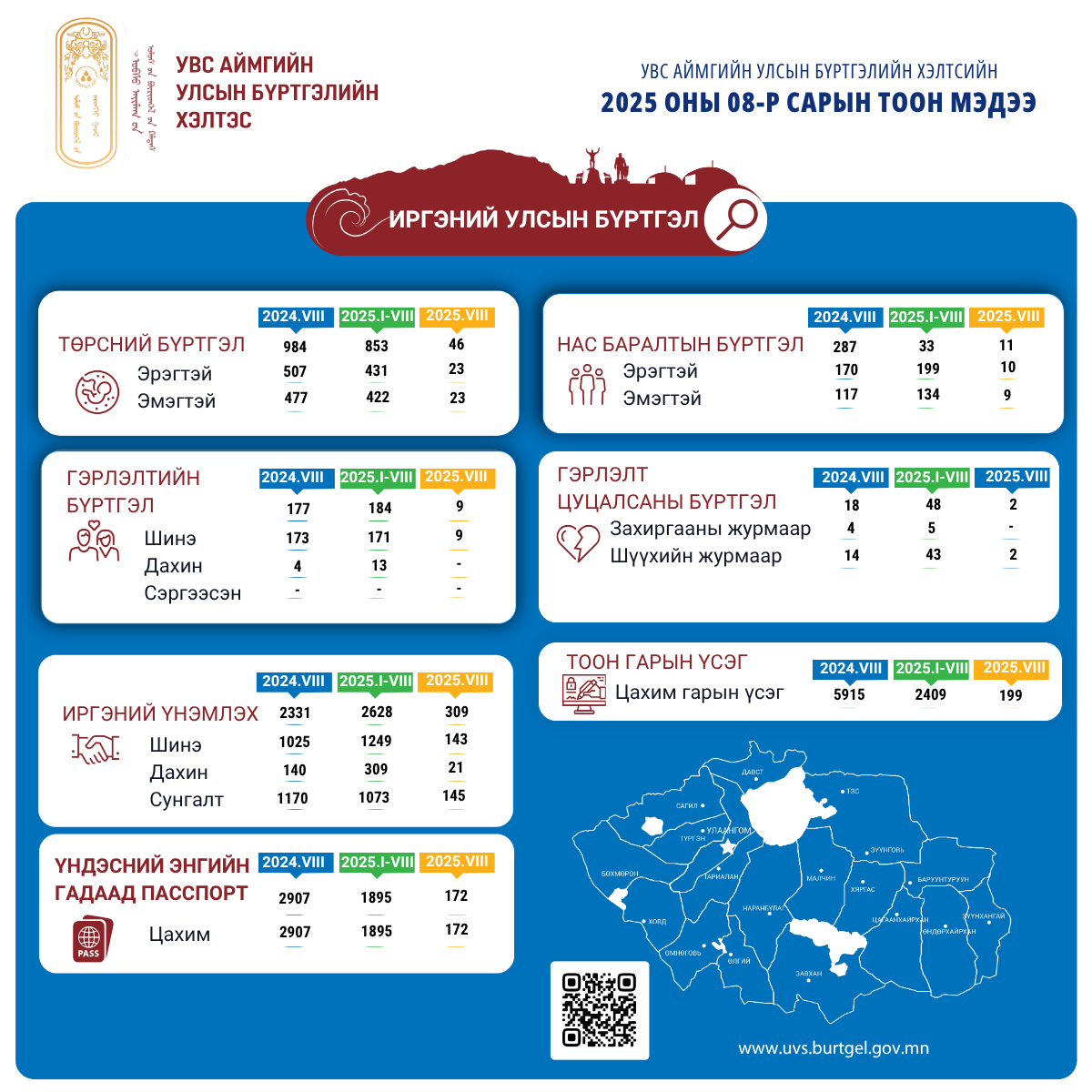 Увс аймгийн улсын бүртгэлийн 2025 оны 8-р сарын тоон мэдээ